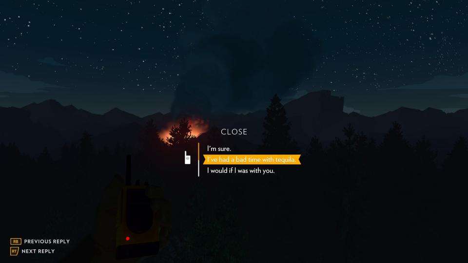 For voluntary fire warden Henry, it's the slow, creeping feeling that he's being watched, and not just by his friendly, chatty boss Delilah who mans the next watchtower over and gives Henry his daily tasks and assignments. In fact, it's your frequent walkie-talkie conversations with Delilah that help keep Henry grounded over the long summer months in Wyoming's sun-dappled mountains, and Firewatch's bounty of branching dialogue options provide plenty of scope to broaden your relationship with your intriguingly distant mentor or keep her at arm's length.